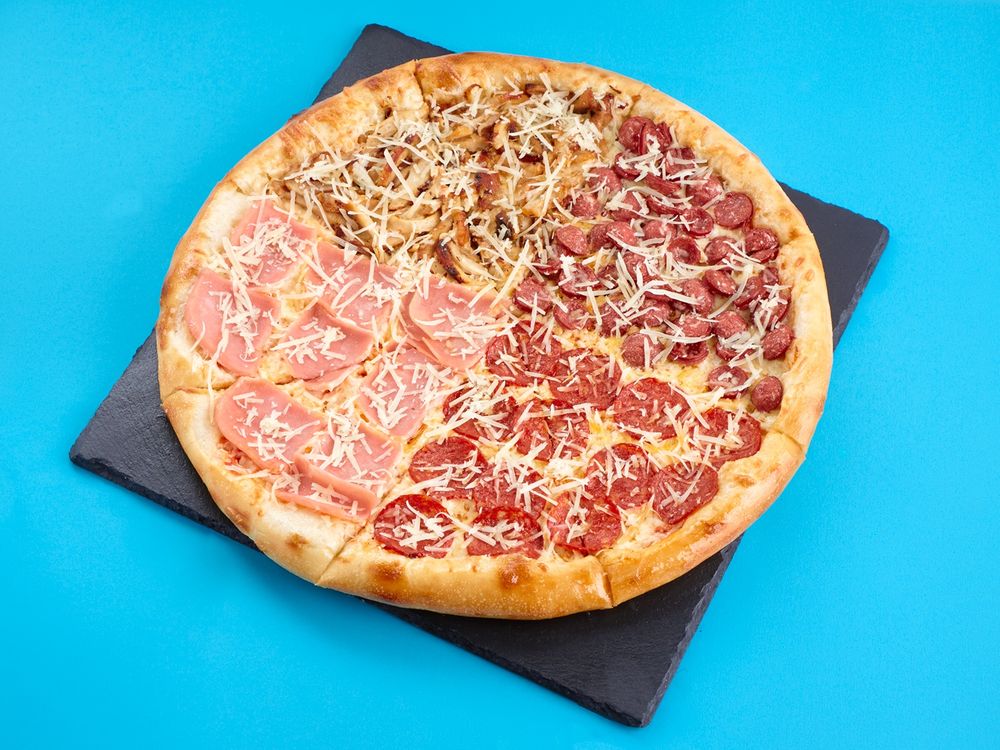 Пицца-соус томатный, сыр Моцарелла, колбаса Пепперони, колбаски охотничьи, ветчина, филе курицы, сыр Пармезан