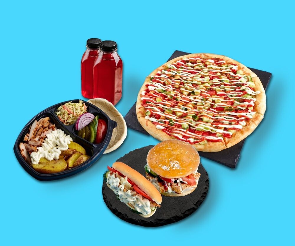 Шаверма на тарелке, пицца Шаверма (33 см), Шава-бургер, Хот-дог Шаверма, морс Черная смородина собственного производства (1 л)