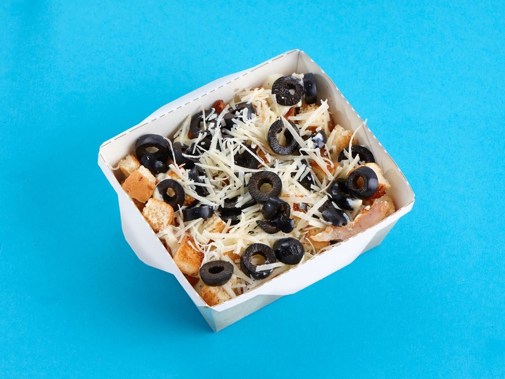 Пекинская капуста, огурец, помидор, куриное филе бедра, обжаренное на мангале, соус фирменный, сыр пармезан, маслины и сухарики