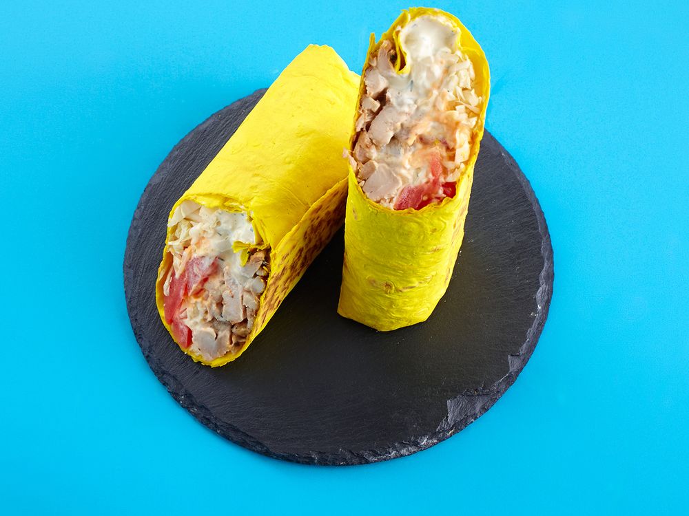 Сырный лаваш, куриное бедро, приготовленное на мангале, томат, капуста по пекински, сырный соус, сыр, фирменный соус