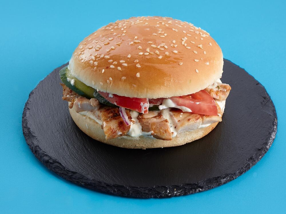 Булочка с кунжутом, Шава-соус, салат, куриное бедро, приготовленное на мангале, помидор, огурец, лук