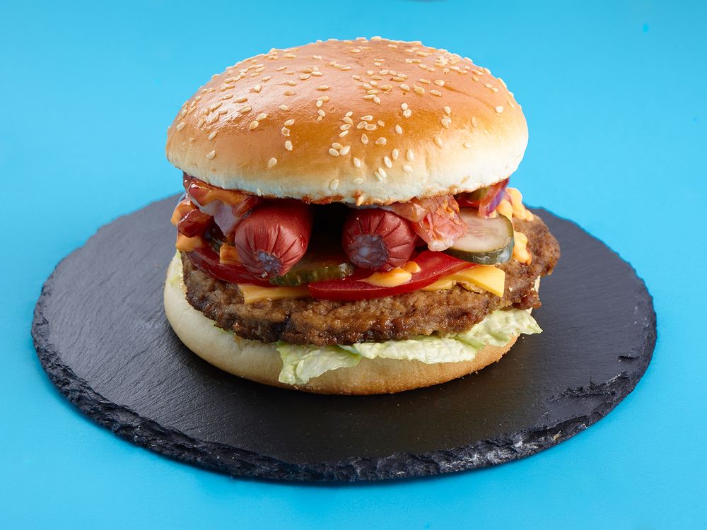 Булочка с кунжутом, бургер соус, капустный салат, говяжья котлета, сырный соус, бекон, салатный лист, помидор, красный лук, колбаски, маринованный болгарский перец, сыр, соус BBQ