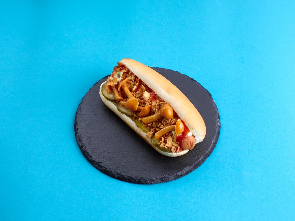 Булочка, лист салата, горчица, сосиска говяжья, маринованные опята, майонез, сыр пармезан, лук фри