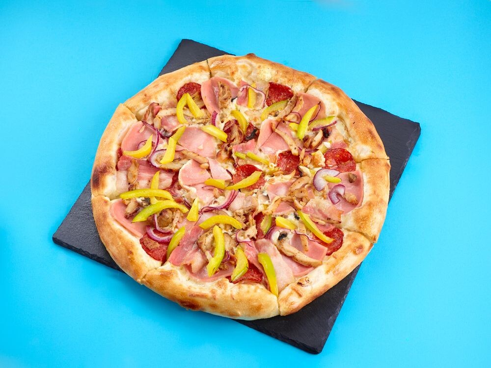 Фирменный чесночный соус, сыр Моцарелла, пепперони, курица, свинина, ветчина, зеленый перец, грибы, красный лук