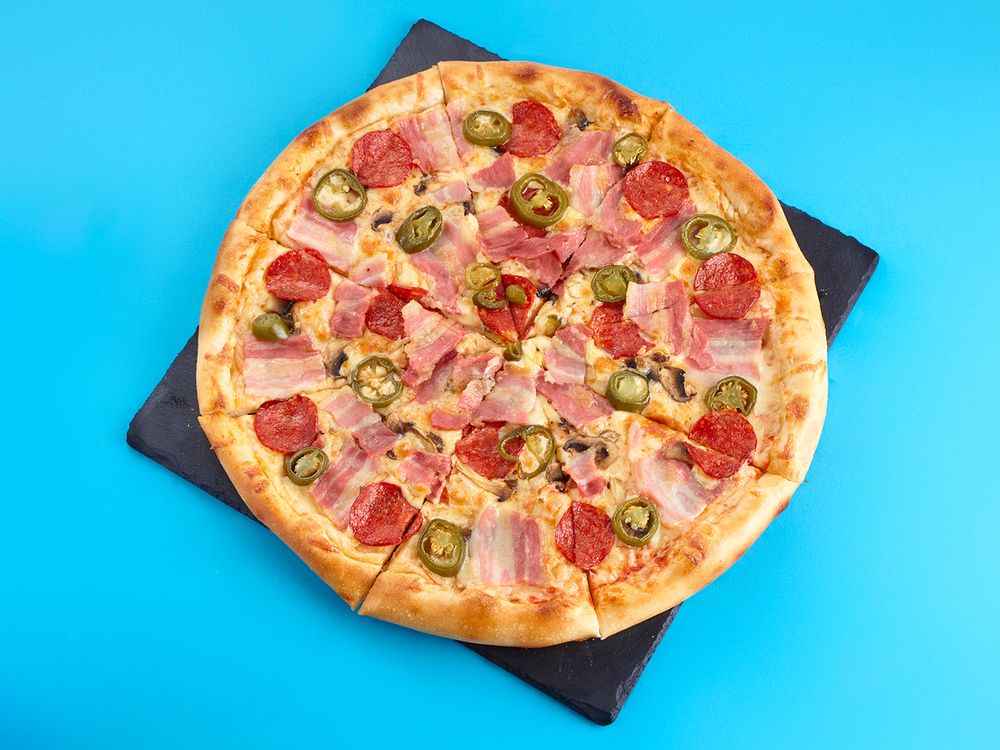 Соус томатный, сыр моцарелла, шампиньоны, колбаса пепперони, бекон, халапеньо