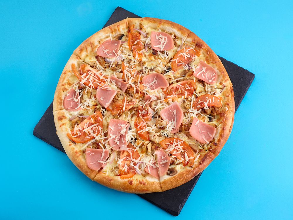 Соус сливочно-чесночный, сыр моцарелла, шампиньоны, лук, ветчина, курица, томаты
