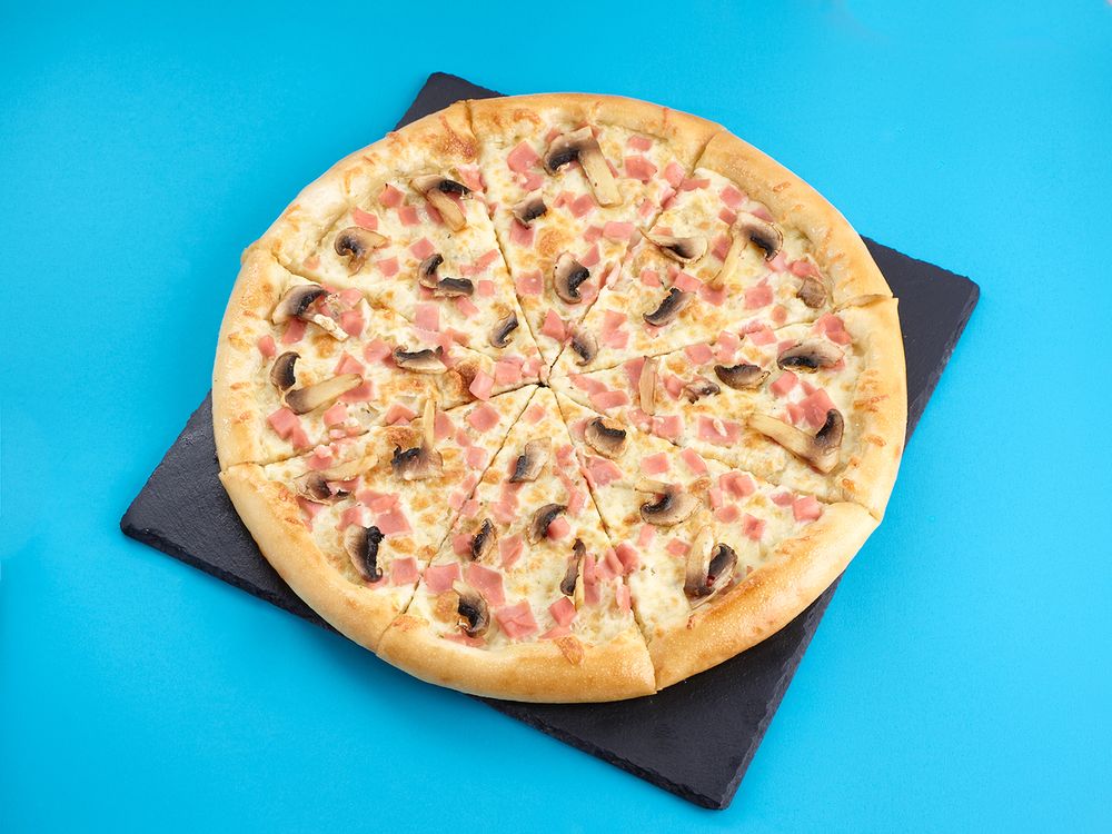 Соус альфредо, ветчина, грибы, сыр моцарелла