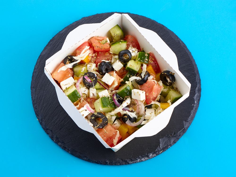 Томат, огурец, красный перец, китайская капуста, оливки, красный лук, базилик, сыр фетакса, орегано, соль, сок лимона, оливковое масло