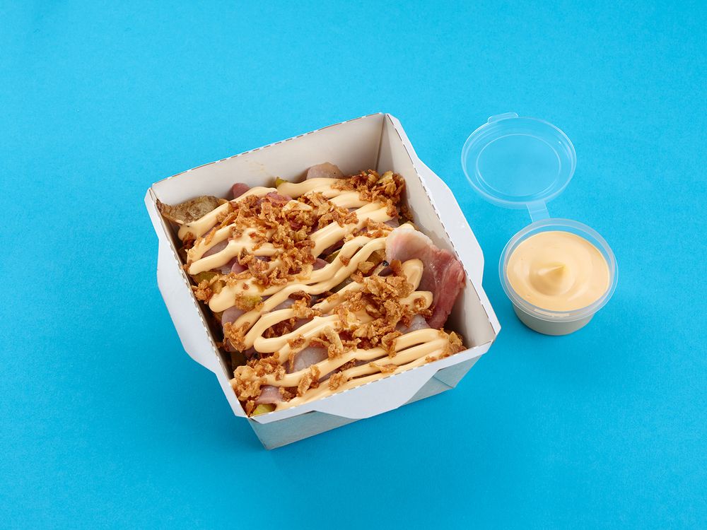 Домашний картофель, запечённый в духовке с луком фри и беконом, сырный соус