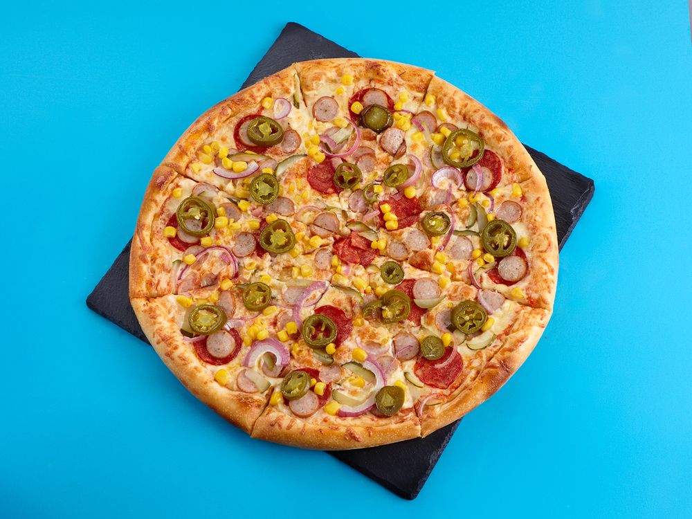 Тесто традиционное, томатная основа, пепперони, сосиски Чили, красный лук, красный халапеньо, кукуруза сладкая консервированная, маринованный огурец, пармезан, соус Чили, орегано (24 см)