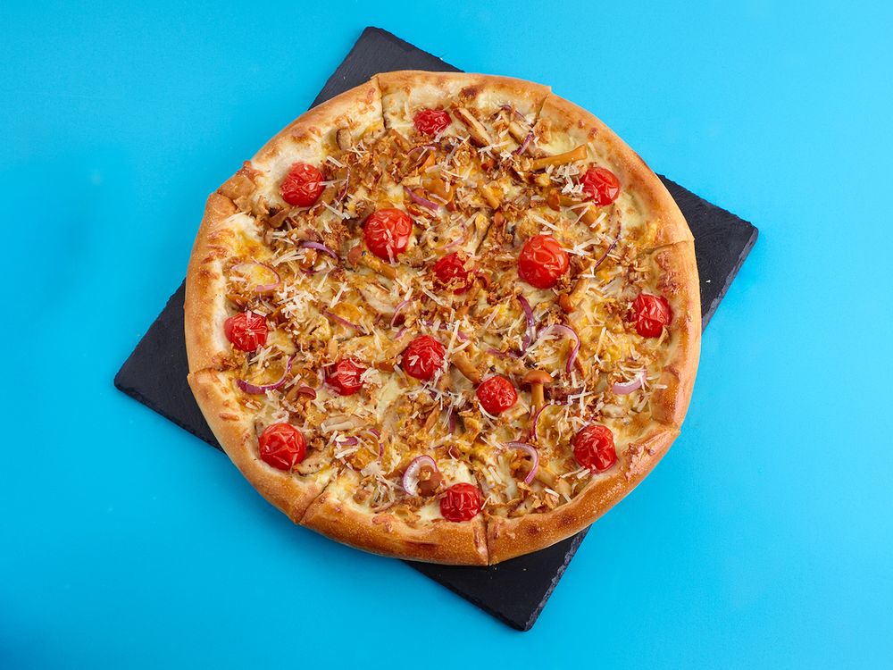 Традиционное тонкое тесто, соус альфредо, томаты черри, копченая курица, опята маринованные, лук репчатый, сыр чеддер, сыр пармезан (33 см)