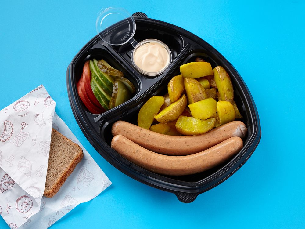 Картофель по-деревенски, молочные сосиски 2шт, огурец нарезка, кетчуп, хлеб