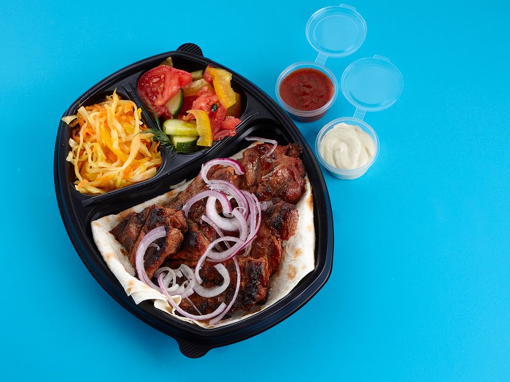 Свиная шея, обжаренная на мангале (250 г), витаминный салат, пита, красный и белый соус, томат и огурец