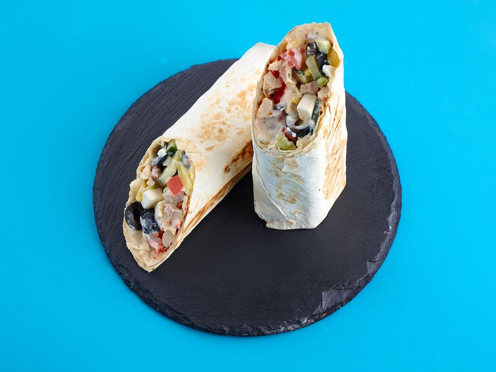 Лаваш, куриное филе, обжаренное на гриле, огурцы свежие, помидоры свежие, оливки, перец болгарский, красный лук репчатый, сыр фета, прованские травы, соус фирменный