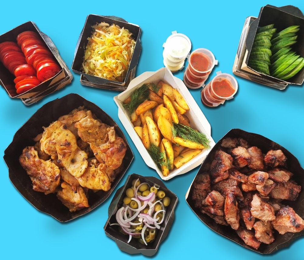 Шашлык из свинины (шея; 1,7 кг), шашлык из курицы (филе бедра; 1,7 кг), нарезка огурец (400 г), нарезка томат (400 г), зелёный лук, салат витаминный (свежая капуста, морковь, сладкий перец; 500 г), домашний картофель запеченный в духовке, чёрный хлеб (6 шт.), пита (6 шт.), белый соус (5 шт.), кетчуп (5 шт.), красный соус (5 шт.), морс Чёрная смородина собственного производства (2 л)