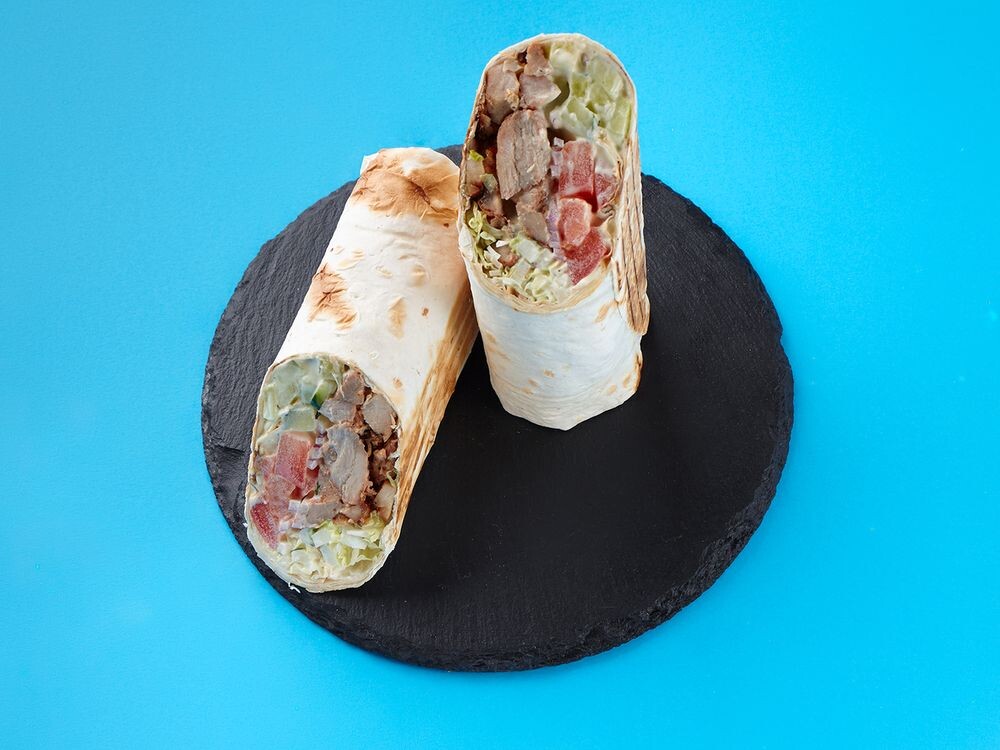 Лаваш, шея свиная обжаренная на мангале, огурец, томат, пекинская капуста, фирменный соус