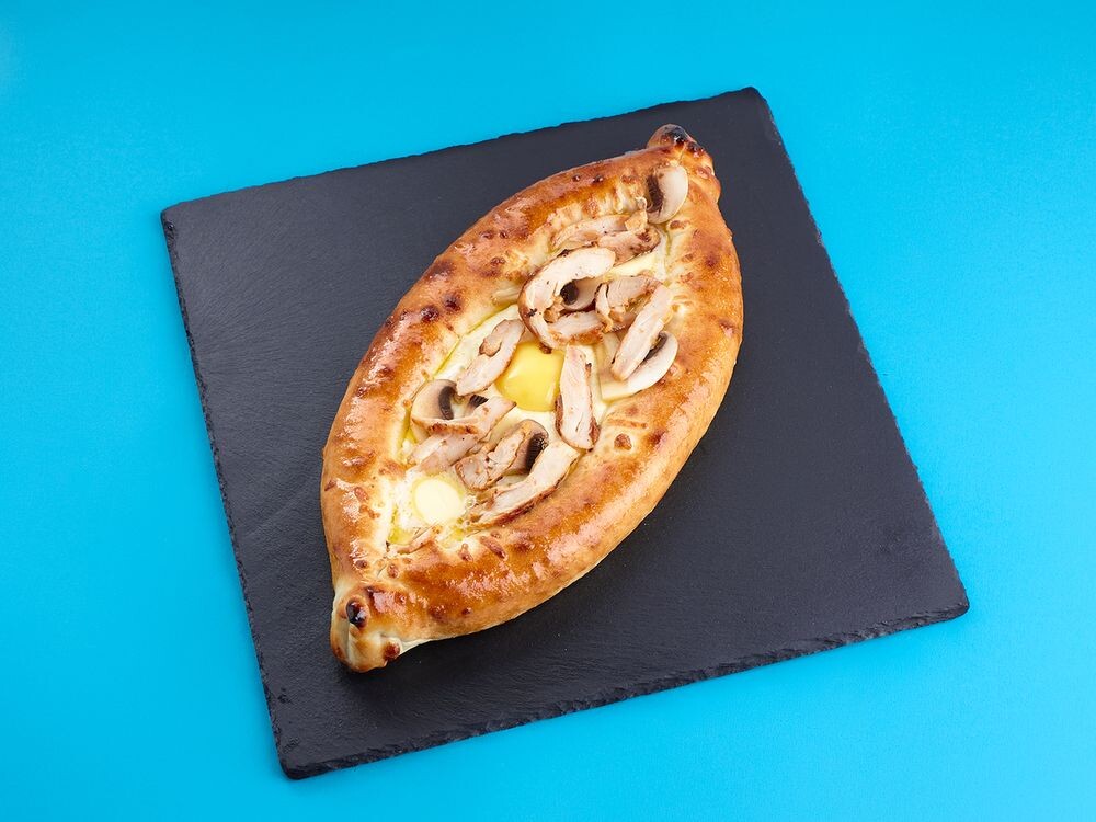 Тесто дрожжевое, сыр Сулугуни, сыр Моцарелла масло сливочное, сливки, шампиньоны, филе бедра курицы обжаренное на мангале, яйцо