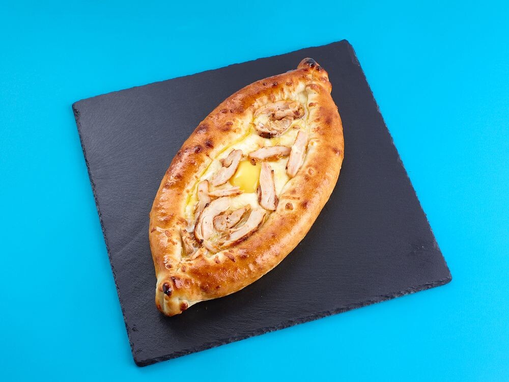 Тесто дрожжевое, сыр сулугуни, масло сливочное, филе бедра куриное, обжаренное на мангале, яйцо