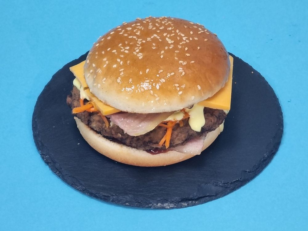 Булочка, бекон, огурец соленый, котлета говяжья, морковь по-корейски, бургер-соус, сыр, соус BBQ