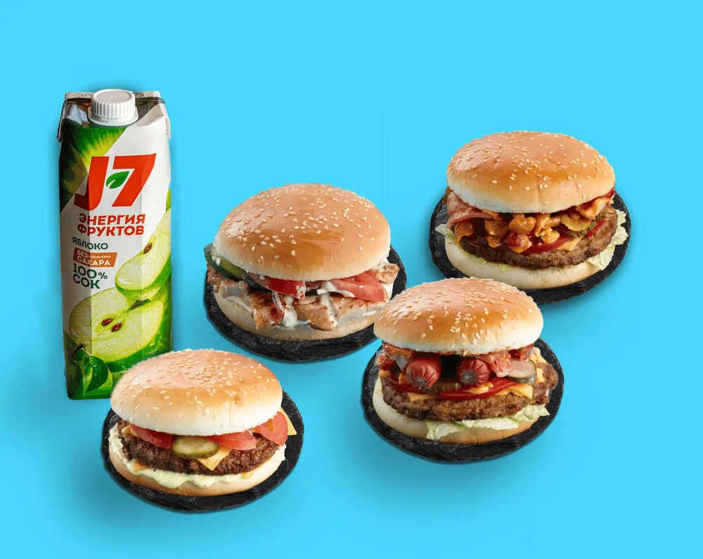 Бургер, Шавабургер, бургер Сытый папа, бургер Супер биф, сок J7 яблочный (1 л)