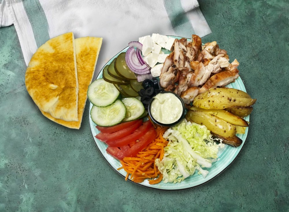 Пита, филе куриное, картофель айдахо, свежий огурец, свежий томат, соленый огурец, лук красный, соус шава, сыр фетакса, капуста пекинская, маслины
