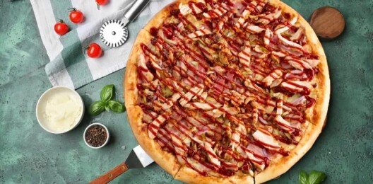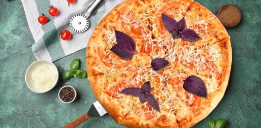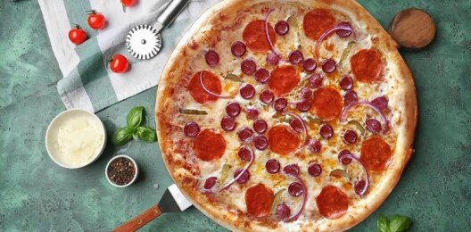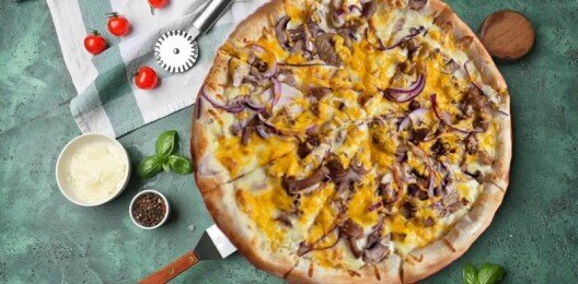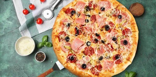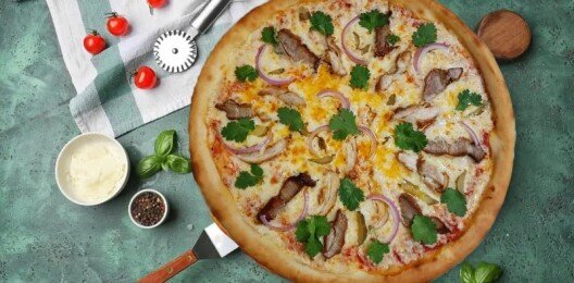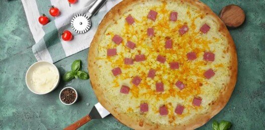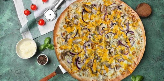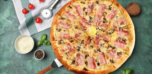 Традиционное тесто, сливочная основа, сыр моцарелла, грудинка свиная, брынза, пармезан, красный лук, маслины черные, масло оливковое, орегано