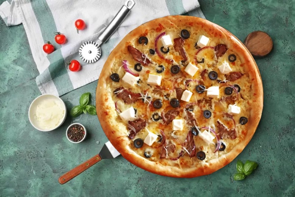 Традиционное тесто, сливочная основа, сыр моцарелла, грудинка свиная, брынза, пармезан, красный лук, маслины черные, масло оливковое, орегано