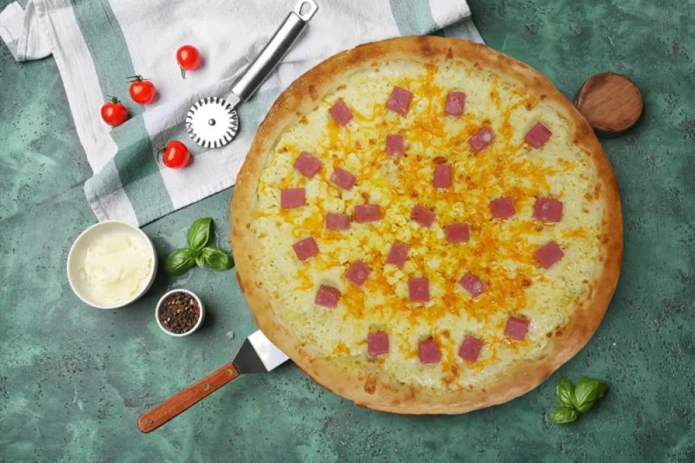Традиционное тесто, сыр моцарелла, чыр чеддер, ветчина, сливочная основа