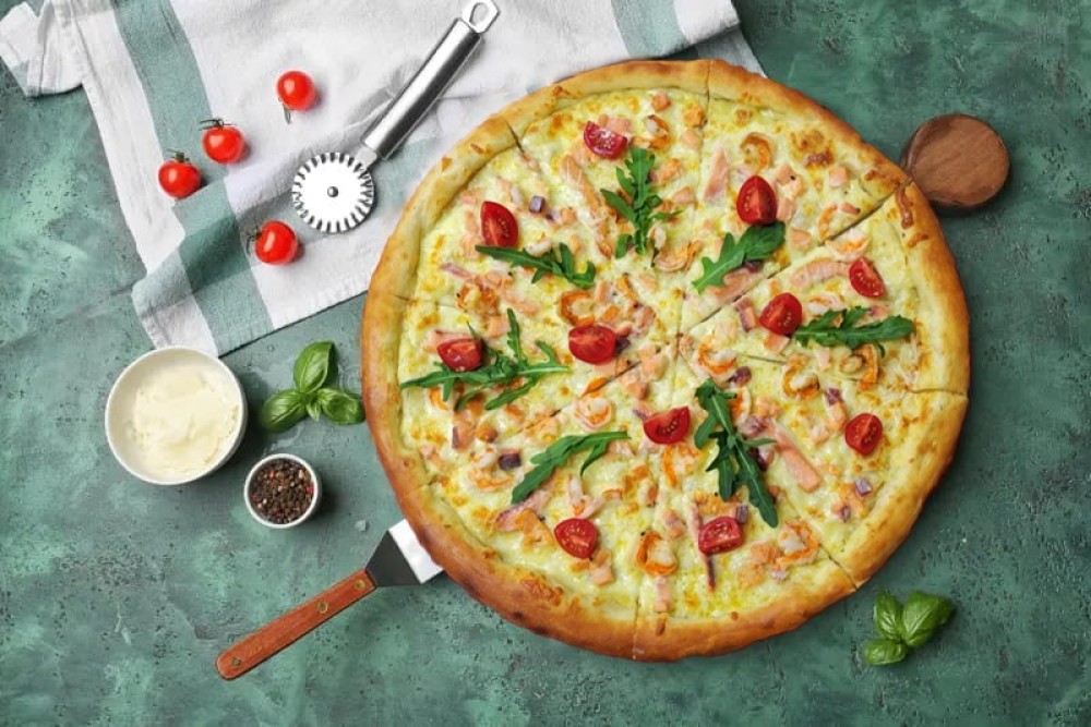 Традиционное тесто, сыр моцарелла, креветки, лосось, томат черри, руккола, сливочная основа