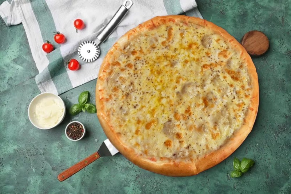Традиционное тесто, сливочная основа, сыр моцарелла, фета, чеддер, пармезан