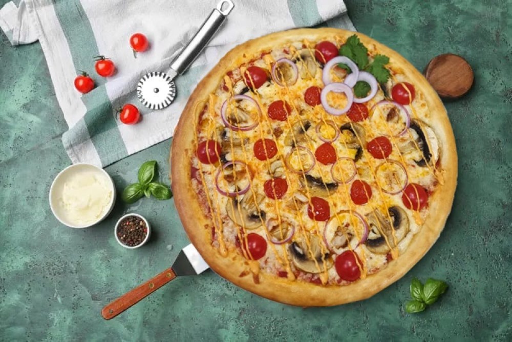 Традиционное тесто, томатная основа, сыр моцарелла, филе курицы с мангала, фирменный соус том ям, томат черри, красный лук, шампиньоны