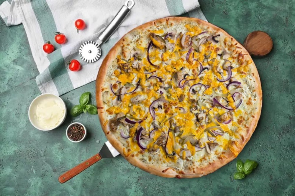 адиционное тесто, сыр моцарелла, чеддер, филе цыпленка, маринованный огурец, шампиньоны, красный лук, сливочная основа