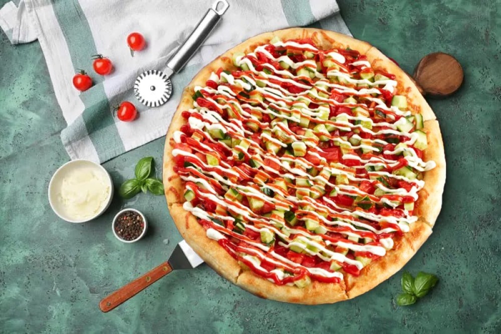 Традиционное тесто, сыр моцарелла, филе цыпленка, свежий огурец, томат, соус фирменный, кетчуп