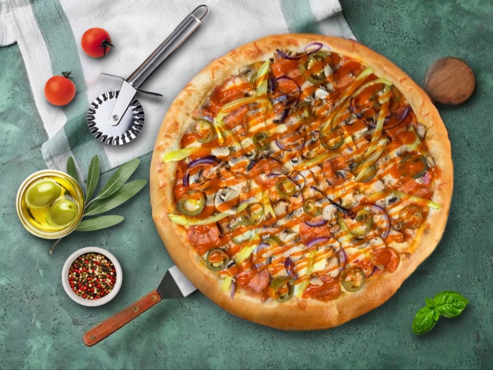 Традиционное тесто, сыр моцарелла, пепперони, халапеньо, болгарский перец, охотничьи колбаски, филе бедра цыпленка, соус шрирача