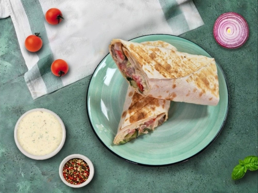 Лаваш, морковь по-корейски, свинина с мангала, филе бедра с мангала, ветчина из индейки, соленый огурец, шава соус