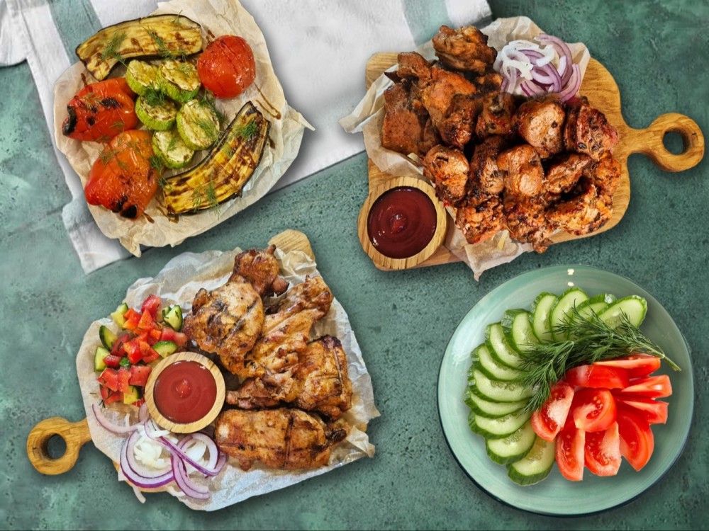 Шея свиная 1кг, курица филе бедра бк 1кг, овощи гиль 500гр, нарезка из свежих овощей 300гр