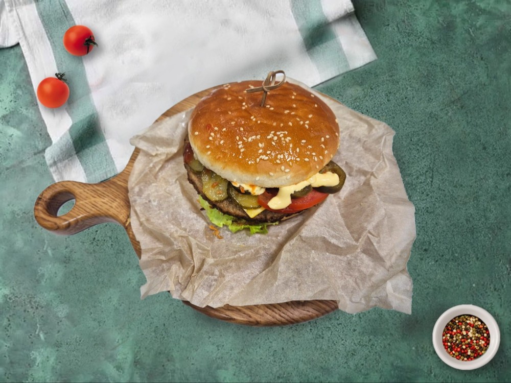 Булочка, говяжья котлета, салат айсберг, томат, лук фри, халапеньо, сыр чеддер, соленый огурец, сырный соус, бургер соус, кетчуп