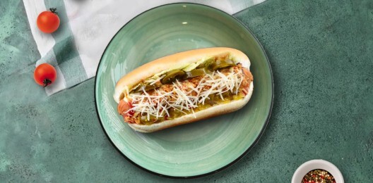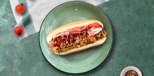 Булочка, сосиска, соленый огурец, кетчуп, горчица, майонез, лук фри