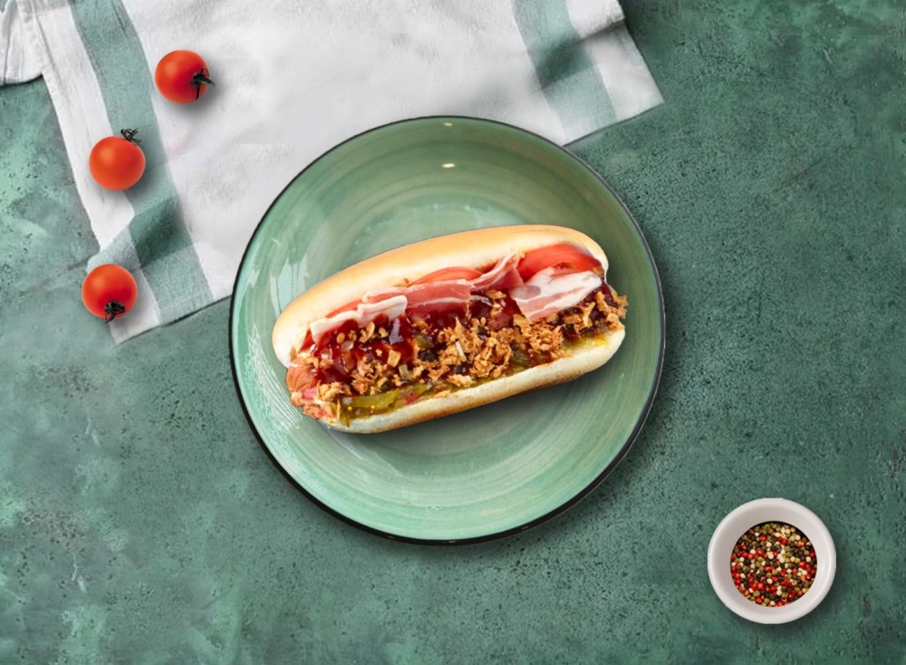 Булочка, сосиска, бекон, томат, огуречный салат, майонез, соус барбекю, лук фри