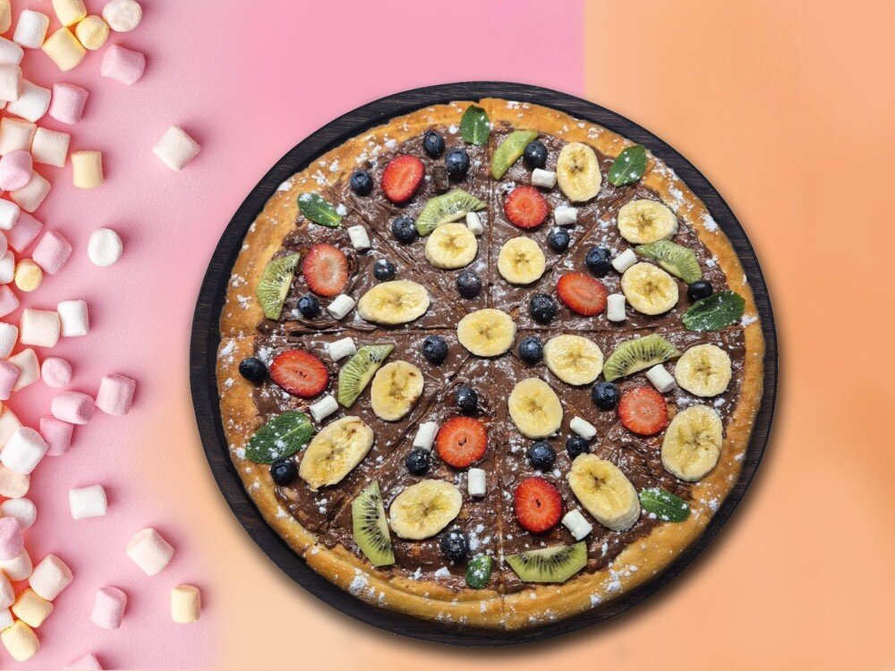 Пицца 33см (нутелла, клубника, голубика, мята) Гонконгская вафля Тутти фрукты Сметанник 2шт Орешек с варенкой