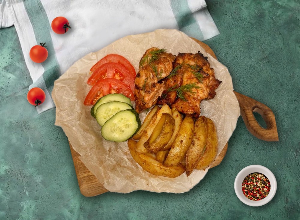 Филе бедра курицы с картофелем по деревенски, кетчуп, фирменный соус