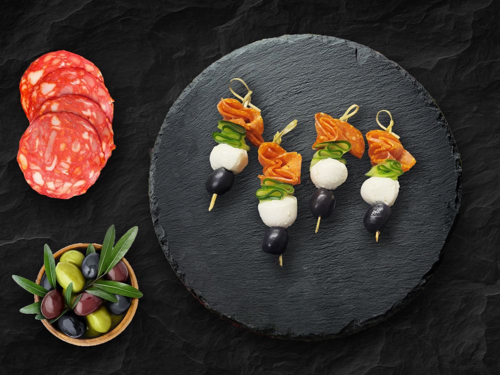 Моцарелла шарики, огурец, салями, маслины(8 шт)