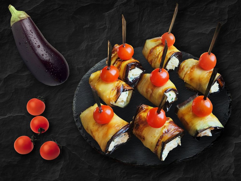 Баклажан, сыр гауда, сливочно-чесночный соус, творожный сыр( 8 шт)