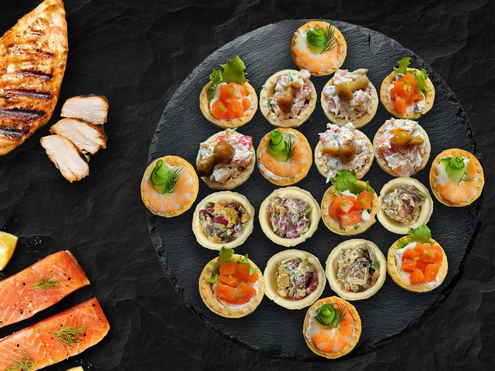 Тарталетки с фасолью, грибами и грецким орехом (5 шт.), тарталетки с курицей (5 шт.), тарталетки с лососем (5 шт.), тарталетки с креветками (5 шт.)